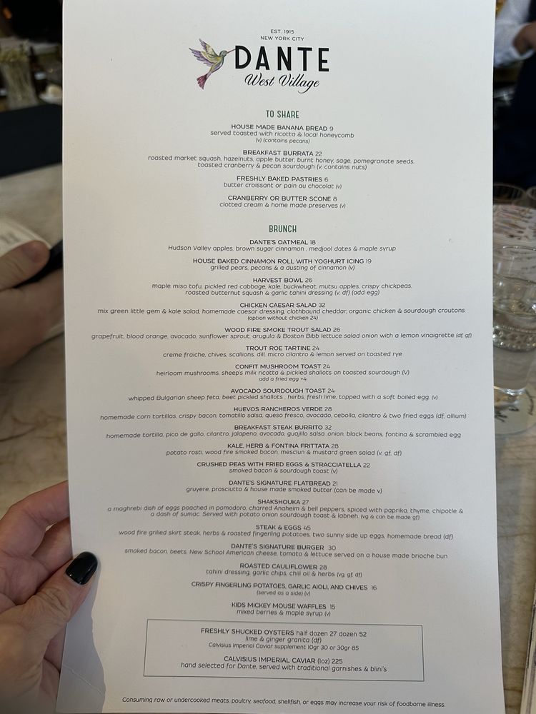 Introducing the menu at Dante West Village, a trendy yet classy cocktail bar in New York City offering a mix of Italian cuisine. With a focus on breakfast and brunch, this spot is known for its delicious dishes and strong martinis. Customers rave about the huevos rancheros and mushroom toast with wild mushrooms. The atmosphere is welcoming, with excellent service and a full bar for all your cocktail needs. Outdoor seating adds to the charm of this upscale establishment. Make sure to reserve a table in advance, especially during happy hours, to enjoy the experience fully. Don't miss out on their unique cocktails and delectable desserts like tiramisu and carrot cake. Overall, Dante West Village is a must-visit spot for a memorable dining experience in the West Village.